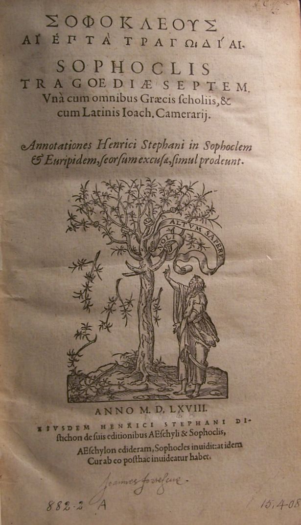 Tragoediae septem. Una cum omnibus Graecis scholiis, & cum Latinis Ioach. Cameraij. [Geneva]: Henricus Stephanus, 1568, 2 parts in one volume, 4to, Greek and Latin text, woodcut device on title, edited by Henri Estienne, early 19th century calf, some damp-staining at beginning and end not affecting title, neat library number in ink at foot of title, some early marginal annotations & scoring, lower board virtually detached, slightly rubbed