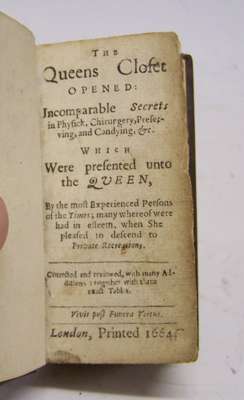 The Queens closet opened: incomparable secrets in physick, chyrugery, preserving and candying &c. which were presented unto the Queen London: printed 1664, 12mo, 3 parts in one volume, period style blind-stamped calf, raised bands, lacking frontispiece and O6, E4 repaired with loss of a few letters