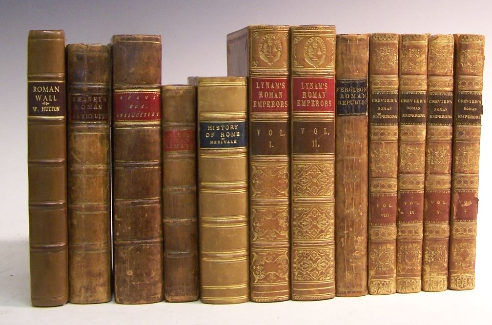 The history of the roman wall. London, 1802, 8vo, folding map, modern half calf gilt, new endpapers, ink stamp on original endpaper; Kennet, Basil Rome antique notitia. London, 1773, 8vo, portrait frontispiece, folding plates, contemporary calf gilt, rubbed, bookplate; Adam, Alexander Roman antiquities. London, 1801, 8vo, fifth edition, contemporary calf gilt, rubbed at edges, some spotting, bookplate; D'Arnay, M. The private life of the romans. Edinburgh, 1761, 8vo, contemporary calf gilt, some cracking to hinges, some foxing; Crevier, John Baptist Lewis The history of the Roman emperors. London, 1814, 8vo, 10 volumes, contemporary calf gilt, red and black labels, hinges cracking, interiors clean; and 9 other 19th century volumes on Rome (23)