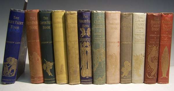 The blue fairy book. London, 1890, fourth edition, 8vo, illustrated, original decorative blue cloth gilt, rubbed at edges, foxing, bookplate; Ibid. The red fairy book. London, 1891, third edition, 8vo, illustrated, original decorative red cloth gilt, backstrip sunned, corners bumped, spotting, bookplate and owner's ink inscription on front endpaper; Ibid. The green fairy book. London, 1892. First edition, 8vo, illustrated, original decorative green cloth gilt, some rubbing to edges, foxing, bookplate of Hamilton of Carnell; Ibid. The yellow fairy book. London, 1894. First edition, 8vo, illustrated, original yellow cloth gilt, rubbed at edges, corners worn, foxing, bookplate and a 1901 copy with heavily faded and discoloured binding; Ibid. The pink fairy book. London, 1906, new impression, 8vo, illustrated, original decorative pink cloth gilt, backstrip and edges faded, foxing; Ibid. The grey fairy book. London, 1900. First edition, 8vo, illustrated, original grey cloth gilt, corners bumped, some spotting, bookplate; Ibid. The violet fairy book. London, 1901. First edition, 8vo, illustrated, original decorative cloth gilt, edges of boards stained, head and tails chipped, bookplate; Ibid. The crimson fairy book. London, 1903. First edition, 8vo, illustrated, original decorative cloth gilt, decorative endpapers, backstrip sunned, some rubbing, bookplate; Ibid. The brown fairy book. London, 1904. First edition, 8vo, illustrated, original cloth gilt, decorative endpapers, some rubbing to head and tail of spine, bookplate; Ibid. The olive fairy book. London, 1907. First edition, 8vo, original cloth gilt, decorative endpapers, owner's ink inscription on reverse of frontispiece; Ibid. The lilac fairy book. London, 1910. First edition, 8vo, illustrated, original cloth gilt, backstrip sunned, bookplate and 11 others by Andrew Lang; Kirk, R. The secret commonwealth of elves, fauns and fairies. Stirling, 1933, 8vo, presentation copy from R. Cunninghame-Graham, frontispiece by D.Y. Cameron, original cloth gilt, dustwrapper, chipped and stained; Halifax, John & Goble, Warwick The fairy book. London, 1913, 8vo, 32 colour plates, original decorative cloth gilt, some rubbing to gilt on boards, foxing; Ozaki, Yei Theodora The Japanese fairy book. London, 1903, 8vo, illustrated, original cloth gilt, worn, hinges weak (26)