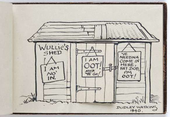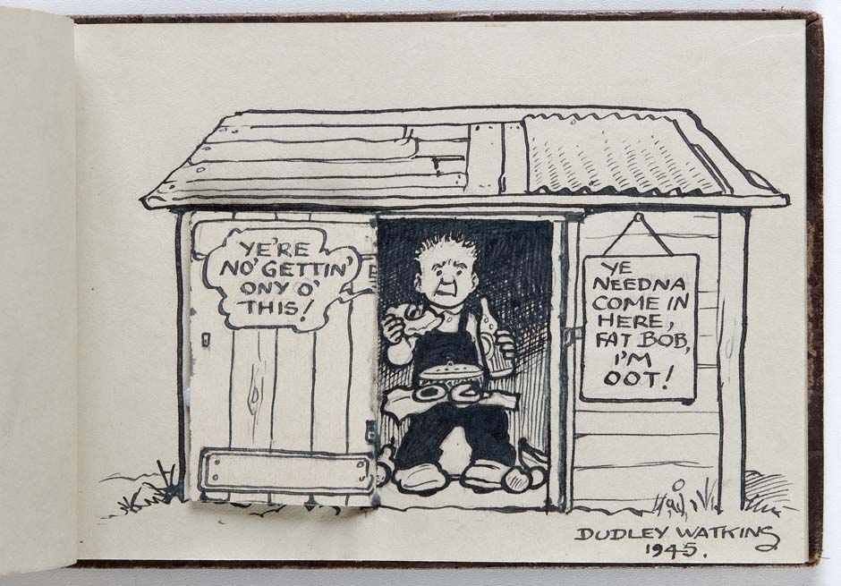 An original illustration of Oor Wullie in his shed, signed and dated by Watkins 1945, approx 11cm by 15cm, with a moveable door opening to show Oor Wullie seated on his buchet eating a sandwich, on a leaf in an autograph book