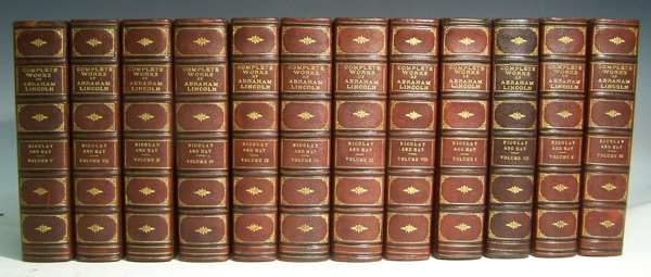 Complete works of Abraham Lincoln. New York: Francis D. Tandy Company, 1905, Gettysburg Edition, 8vo, 12 volumes, number 618 of 700 sets, edited by John Nicolay & John Hay, contemporary red morocco gilt, some fading, inner hinges strengthened, some browning, blind stamps to titles