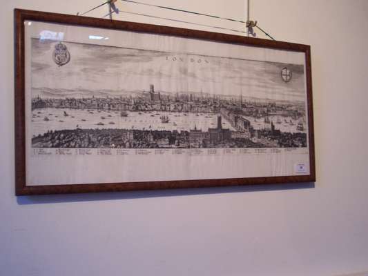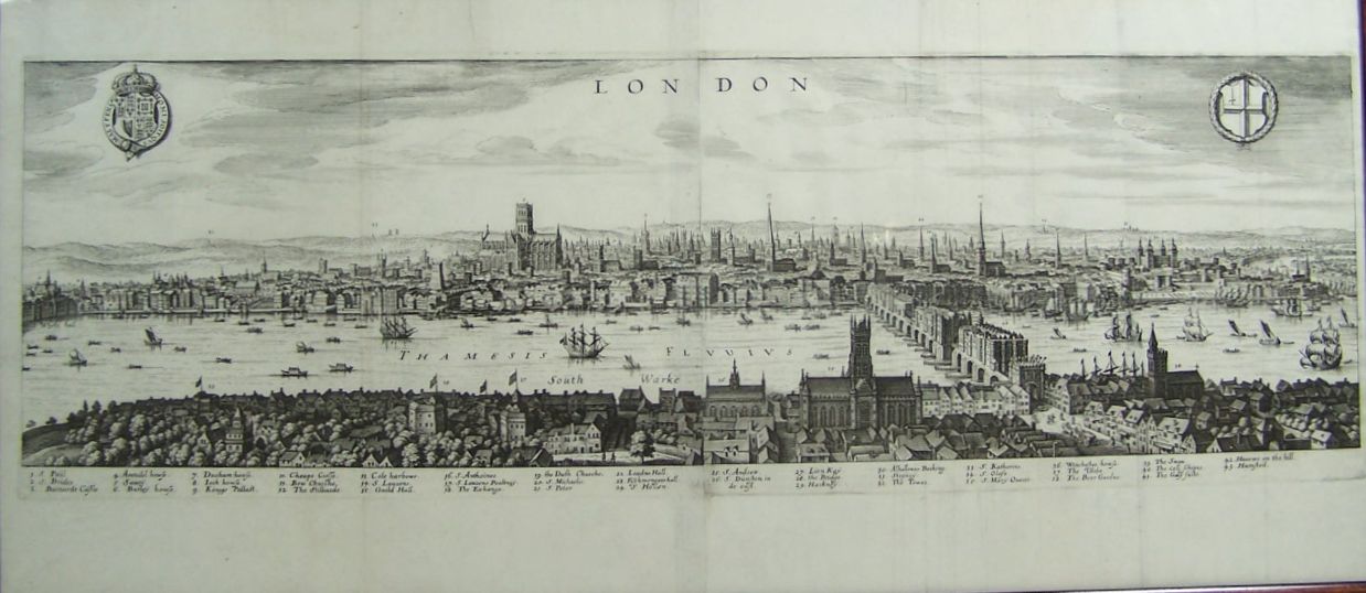 Note: A prospect of London before the great fire.. The view shows from the King's Palace at Whitehall to the Tower of London and St Katherine's Church in the East. Old St. Paul's can be seen in the centre of the view. The Globe (Shakespeare's theatre) and the bull-baiting ring can be seen in Southwark