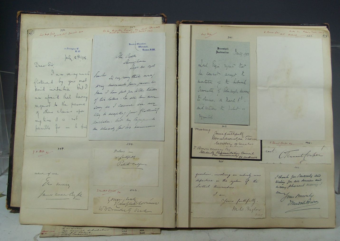clipped autographs, &c., chiefly of Scottish interest, including Sir Edward Grey, J. St. L. Strachey, Augustine Birrell, Thomas Chalmers, Cecil Harmsworth, Henry Campbell-Bannerman (2), J.W. Bazalgette, Horatius Bonar, Andrew Lang, Sidney Lee, Gleeson White, Laurence Housman, Owen Seaman, Cunningham-Grahame, c.130 letters, and numerous clipped autographs, scraps &c., pasted into half morocco album, worn