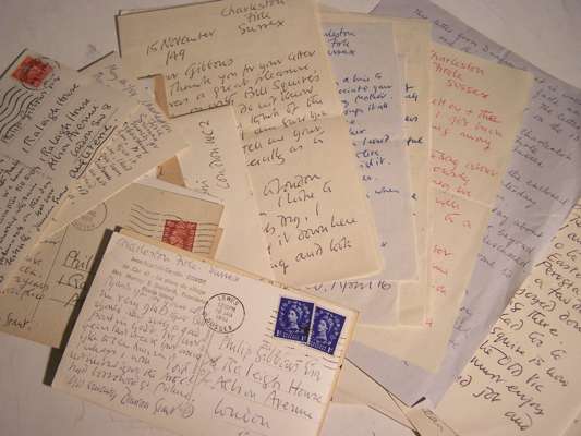 21 autograph letters signed and 13 autograph postcards signed to P.C. Gibbons about painting the actor Bill Squires's portrait, 1940's and 1950's, mostly from Charleston, Firle, Sussex, "I see that you do not think the portrait is very like Bill.... people's expressions naturally alter with everyone they meet. What I have tried to go for in my sketch is the structure of his face... perhaps as time goes on you can imagine a smile to come to his lips! Not that I got the impression that Bill is habitually melancholy"