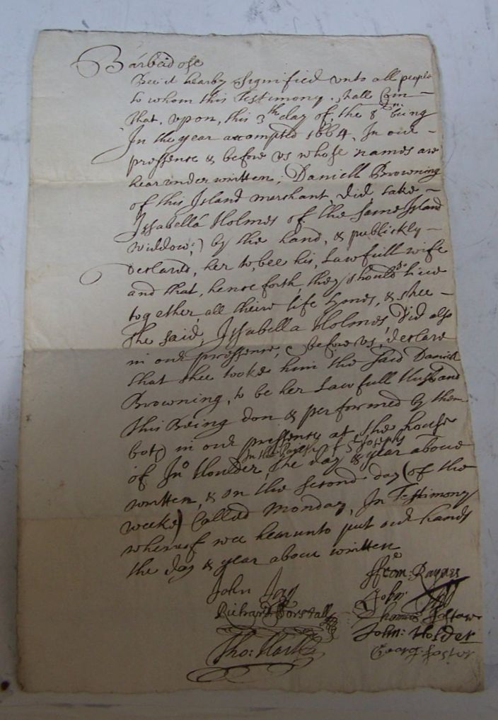 Note: This would appear to be the earliest Quaker marriage certificate recorded for Barbados and a very early Barbados marriage certificate. The earliest lisiting of any Quakers on the island in Brandow's Genealogies of Barbados Families is 1677. British sailors who landed on Barbados in 1625 found the island uninhabited, and British settlers began to arrive in 1627-28.