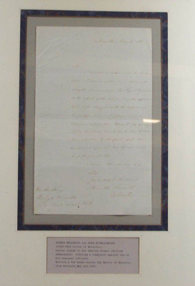 Autograph letter signed to Sir Charles Stuart (British ambassador) refuting a complaint against one of his engineer officers, Brussels, 4 May 1815, 31 x 19cms.; framed and glazed with a hand-coloured mezzotint engraving, c. 35 x 20cm
