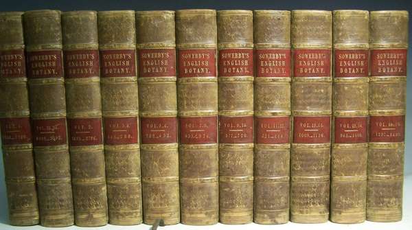 English botany, or coloured figures of British plants. London: for the author, 1790-1846, volumes 1-36 bound in 18 volumes , 4 supplementary volumes and index volume, first edition, 8vo, 2960 hand-coloured engraved plates, and an additional 20 plates (numbered 1-20) bound in volume 2 of the Supplement, contemporary green half calf, brown morocco lettering pieces, very slight offsetting to some plates in volumes 13-14 and 27-32, plate 1257 misnumbered 1256, spines slightly faded and very slightly rubbed