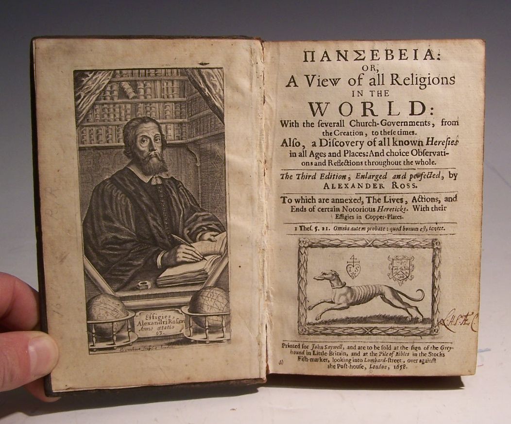 Pansebeia: or, a view of all the religions in the world .. the third edition, enlarged and perfected … To which are annexed The lives, actions, and ends of certain notorius hereticks with their effigies in copper-plates. London: for John Saywell, 1658. 8vo., 2 parts, engraved portrait frontispiece, engraved emblem on the titlepage (repeated on the titlepage to the Lives), 17 engraved portraits in the second work contemporary calf, later rebacking, edges rubbed, general light paper discolouration, inner joints cracking