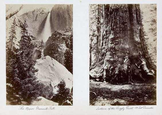 An album of albumen prints containing; Watkins, Carleton 16 albumen prints of Yosemite, circa 1860's, approx 12 by 20cm & 15 by 10cm, all captioned in ink below, one [possibly three] showing Galen Clark; Niagara Falls 5 prints of Niagara falls, c. 1860's, approx 14 by 19cm; various other prints of India and Europe, all pasted onto both sides of leaves, contemporary morocco gilt, gilt insignia on boards