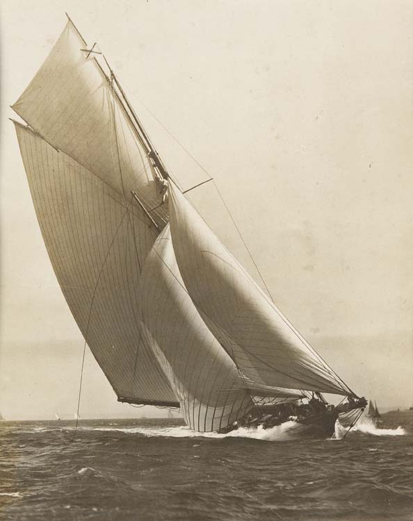 Mohawk, c. 1890's, albumen print, approx 35.5 by 28.5cm, mounted, photgraphers blind stamp; Ibid Thistle, c.1890's, albumen print, approx 34 by 28cm, mounted, photographer's blind stamp; Ibid Stranger, c. 1890's, albumen prints, approx 23 by 28cm, mounted, framed and glazed [damaged]; Ibid Thistle, c. 1890's, approx 38 by 31cm, photographer's blind stamp, foxing to image, framed and glazed; Ibid Unknown yacht, c. 1890's, albumen print, approx 23 by 28cm, mounted, surface scratched, mount foxed, photographer's blind stamp; Beken & Son Mountcam, c. 1900's, approx 29 by 23.5cm, photographer's blind stamp, framed and glazed and 3 other framed and glazed yachting photographs (9)