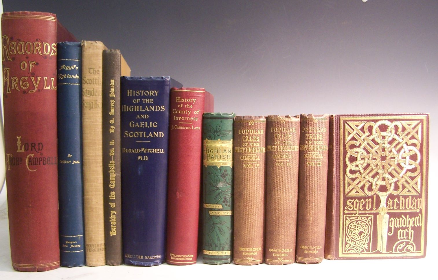 Records of Argyll. Edinburgh, 1885, 4to, number 403 of limited edition, plates, original red cloth gilt, backstrip faded; Bede, Cuthbert Argyll's highlands. Glasgow, 1902, 8vo, illustrated, inscribed by John Campbell on title, original green cloth gilt; Campbell, John Popular tales of the West Highlands. Edinburgh, 1860, 4 volumes, 8vo, original cloth gilt, backstrips faded, some light foxing; Mitchell, Dugald A popular history of the Highlands and Gaelic Scotland. Paisley, 1900, 8vo, frontispiece, original blue cloth gilt; Cameron Lees, J. A history of the county of Inverness. Edinburgh, 1897, 8vo, folding map in pocket, original red cloth gilt, foxing at page edges and 3 others (11)