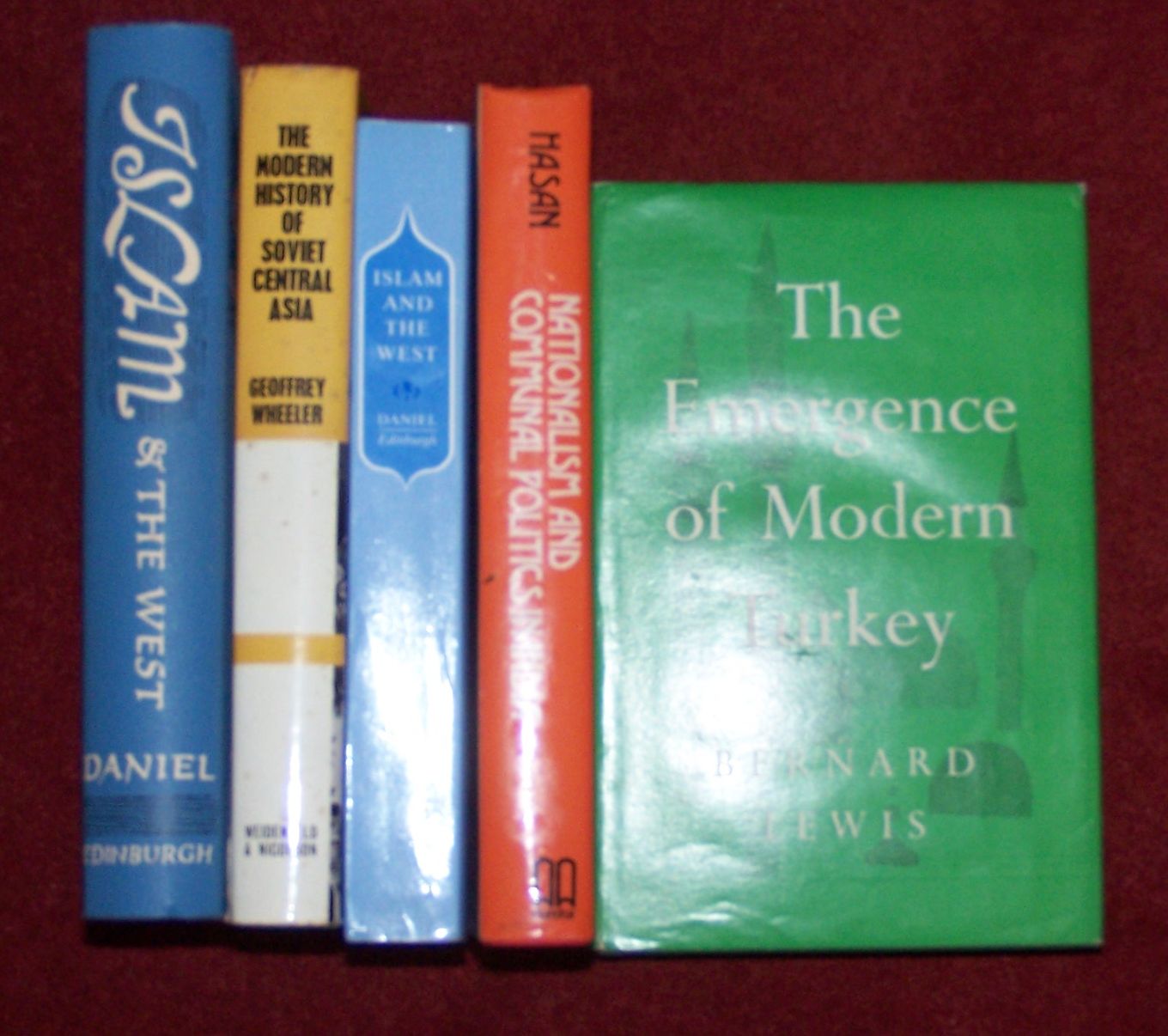 A collection of works on Arabic politics and relations with the West, to include: Lewis, Bernard. The Middle East and the West, 1964; Haim, Sylvia G. Arab nationalism, 1962; Hazem Zaki Nuseibeh. The Ideas of Arab nationalism, 1956; Mushirul Hasan. Communal and Pan-Islamic trends in colonial India, 1981; Kinross, Lord. Ataturk: the rebirth of a nation, 1964; Kamil, M.N.M. The Muslims of Sri Lanka under British rule, 1993; Daniel, Norman. Islam & the West, 1966; Berger, Morroe. The Arab world to-day, 1962; Kamel S. Abu Jaber. The Arab Ba'th Socialist Party: history, ideology and organization, 1966; Gellner, Ernest & Micaud, Charles. Arabs & Berbers: from tribe to nation in North Africa, 1973; Waardenburg, Jean-Jacques. L'Islam dans le miroir de l'occident, 1963; Robinson, Maxime. Islam and capitalism, tr.by Brian Pearce, 1974; Salibi, K.S. The modern history of Lebanon, 1965, and approximately 50 others.
