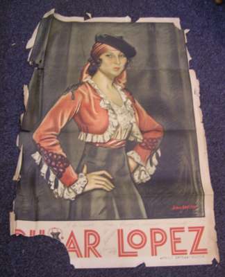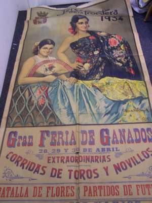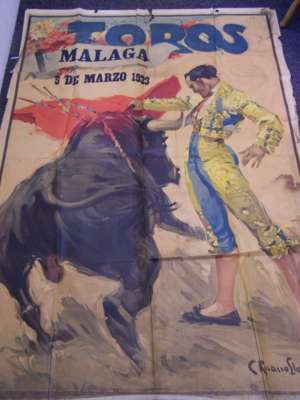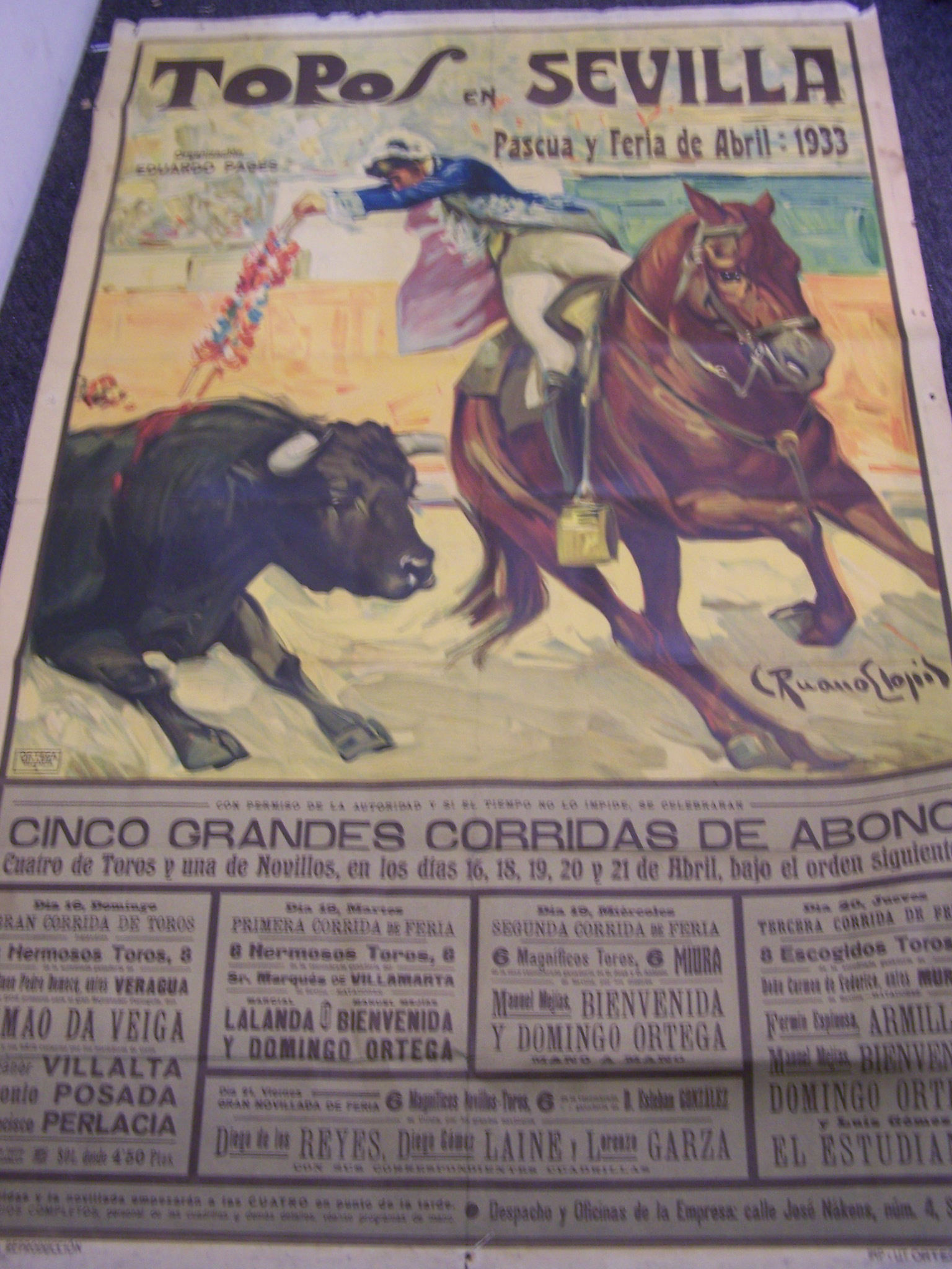 Toros en Sevilla, April 1933, approx 169 by 107cm, tears at edges, waterstaining; Ibid. Toros Malaga, March 1933, approx 169 by 107cm, torn along edges [some loss], waterstaining; Ibid. Plax de toros de Sevilla, April 1936, approx 242 by 116cm, torn along all edges [50 cm tear from bottom edge]; Ibid. Jerez de la Frontera, 1934, approx 240 by 116cm, chipped and torn at edges; Lafita, Juan Dilar Lopez, inscribed by Lopez to Ada Pringle, dated Seville 1934, approx 100 by 68cm, torn [lacking first 3 letters of main title]; Moody Bros Circus poster, c. 1930's, nine sections, each approx 77 by 100cm, some torn (qty)