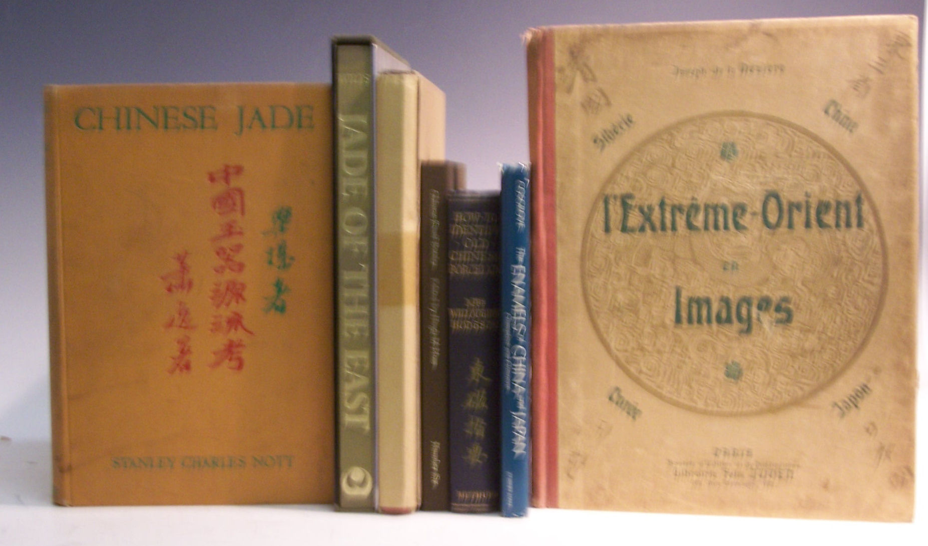 Chinese jade throughout the ages. London, 1936. First edition, 4to, illustrated, original orange cloth, some marking; Wills, G. Jade of the east. New York, 1972. First edition, 4to, illustrated, original cloth gilt, slipcase, a good copy; Christie's Important Chinese snuff bottles from the J. &J. Collection, Part 1. Hong Kong, 2004, 4to, a fine copy in original packaging; Snuff Bottles Chinese snuff bottles from the collection of the Rt. Hon The Marquess of Exeter. London, 1974, 8vo, illustrated original cloth; Hidgson, Mrs W. How to identify old Chinese porcelain. London, 1905, 8vo, original blue cloth gilt; Nézière, J. de la L'extreme-orient en images. Paris, [no date], 4to, illustrations in text, original decorative boards, rubbed, gutta-percha weak; and 33 others on Chinese art, mainly 20th century (39)
