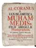 Al-Coranus S. lex islamitica Muhamedis filii Abadllae pseudoprophetae, ad optimorum codicum fidem edita ex museo Abrahmi Hinckelmanni. Hamburg: ex off. Schultzio-Schilleriana, 1694. 4to., title-page in red and black, with both Latin and Arabic half-titles, original paper boards, edges uncut, boards worn and crudely repaired, pastedowns renewed, lower outer corners dog-eared, lower inner joint broken, tear at inner margin of preliminary signature e, general light paper discolouration throughout and some spotting