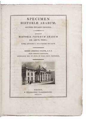 Specimen historiae arabum … accessit Historia veterum arabum ex Abu'l Feda: cura Antonii I. Sylvestri de Sacy; edidit Josephus White. Oxford: e Typographeo Clarendoniano, 1806. Second edition, 4to., engraved portrait frontispiece, engraved vignette on the titlepage, text in Arabic and Latin, with the corrigenda slip at the end, original quarter cloth, paper boards, printed paper label, edges uncut, edges with a little wear, upper inner joint splitting, offsetting from the portrait to the title, some light paper discolouration