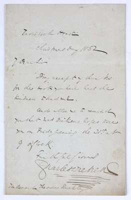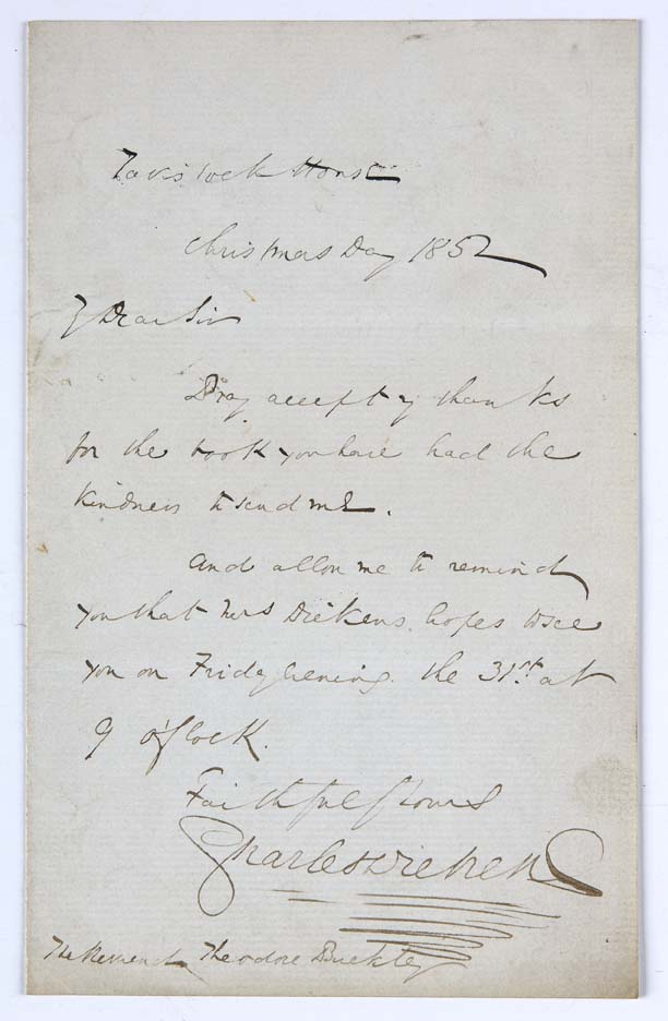 Autograph letter signed, to The Rev. Theodore Buckley "My dear Sir. Pray accept my thanks for the book you have had the kindness to send me. And allow me to remind you that Mrs Dickens hopes to see you on Friday evening the 31st at 9 o'clock. Faithfully yours, Charles Dickens. The Reverend Theodore Buckley, Tavistock House, Christmas Day 1852"
