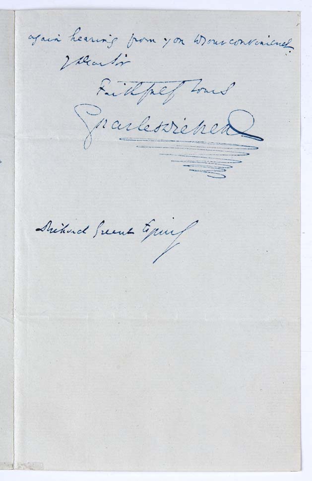 Autograph letter signed, to Richard Greene "Dear Sir. I am happy to acknowledge the receipt of your kind letter, and to assure you that Mr Carlyle, Mr Forster and myself, hail with the greatest interest and satisfaction the prospect of our appeal being responded to the citizens of Lichfield. No help rendered to these poor ladies could possibly be so grateful and welcome as aid coming from the place that boasts of having given Johnson birth.