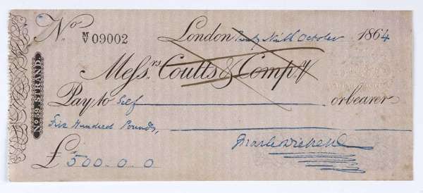 A cheque drawn on Messrs. Coutts and Co. for £500, payed to Self, signed by Charles Dickens, 29th October 1864