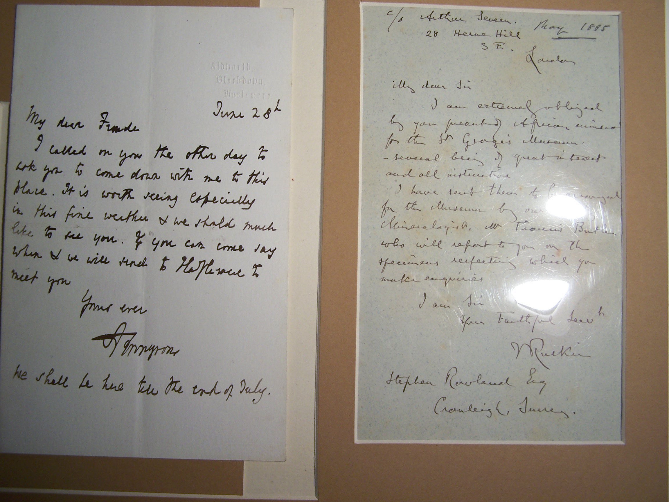 Autograph letter signed from John Ruskin to Stephen Rowland Esq., Cranleigh, Surrey, thanking him for his presents of African minerals for the St. George's museum "several being of great interest and all instructive. I have sent them to be arranged for the Museum by our acting mineralogist Francis Butler who will report to you on the specimens...", one page, 28 Herne Hill, May 1885; Tennyson, Alfred, Lord Autograph letter signed from Tennyson to "My dear Froude", asking him to visit him at Aldworth, Blackdown, near Haselmere "It is worth seeing especially in this fine weather & we should much like to see you. If you can come say when & we will send to Haslemere to meet you. Yours ever A. Tennyson", one page, Aldworth, Blackdown, June 28th (2)