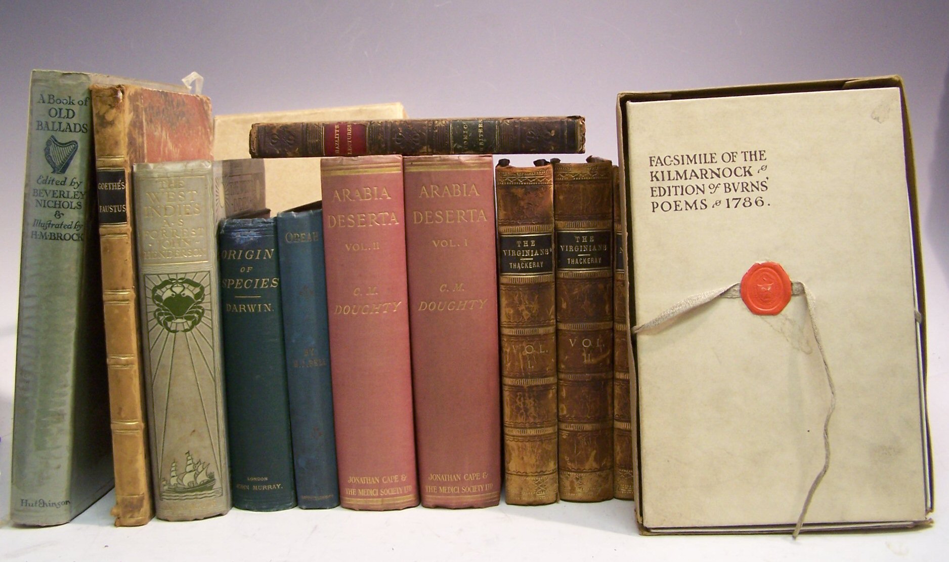 The origin of species, 1872, sixth edition, folding plate, original cloth, upper hinge broken, slightly rubbed at head of spine; Hazlitt, William Lectures on the English comic writers, 1819, contemporary half calf, slightly rubbed; Goethe, J.W. von Faustus, 1832, translated by P.B. Shelley, 4to, engraved frontispiece and 25 (of 26) plates by Retsch, contemporary half calf, slightly rubbed; Burns, Robert Poems. Kilmarnock, 1783 [but c.1933], original wrappers, original box; Henderson, J. The West Indies, 1905, plates, original cloth, faded and slightly marked; Nichols, B. A book of old ballads, 1934, 4to, original cloth; Bell, H.J. Obeah, witchcraft in the West Indies, 1893, original cloth; Doughty, C.M. Travels in Arabia deserta, 1923, 2 volumes, folding map in pocket of volume 1, original cloth, spines slightly faded; Thackeray, W.M. The Virginians, 1858, 2 volumes, 8vo; The Newcomes, 1854, 2 volumes, 8vo, both with additional etched titles and plates, uniform contemporary half calf, some spotting; Simpson, G.G. Scottish handwriting 1150-1650, 1973, dust-jacket (14)