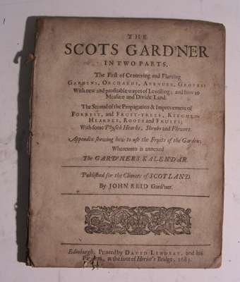 The Scots gardner… Edinburgh: printed by David Lindsay, 1683, 4to, title, perface, blank, [8], 126pp, 4 plates, including the Gardner's Kalender [14 pages [up to October]], disbound, worming to first 5 leaves [only 3 letters lost of publisher's imprint on title], browned