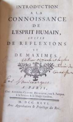 Introduction a la conoissance de l'esprit humain, suivie de reflexions et de maximes. Paris: Antoin-Claude Briasson, 1746. First edition, 12mo (166 x 97mm.), half-title, with the errata leaf, contemporary mottled calf gilt, spine gilt in compartments, pencil markings in margins of first few leaves, joints repaired