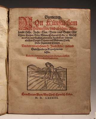 Geometrey. Von künstlichem Feldmessen und absehen, allerhandt Höhe, Fleche, Ebne, Weitte unnd Breyte. Frankfurt-am-Main: C. Egenholph, 1584, 4to, title printed in red and black and with vignette, woodcuts in text, with final blank, bound in a vellum psalter leaf, adhesion to one letter of catchword on I3