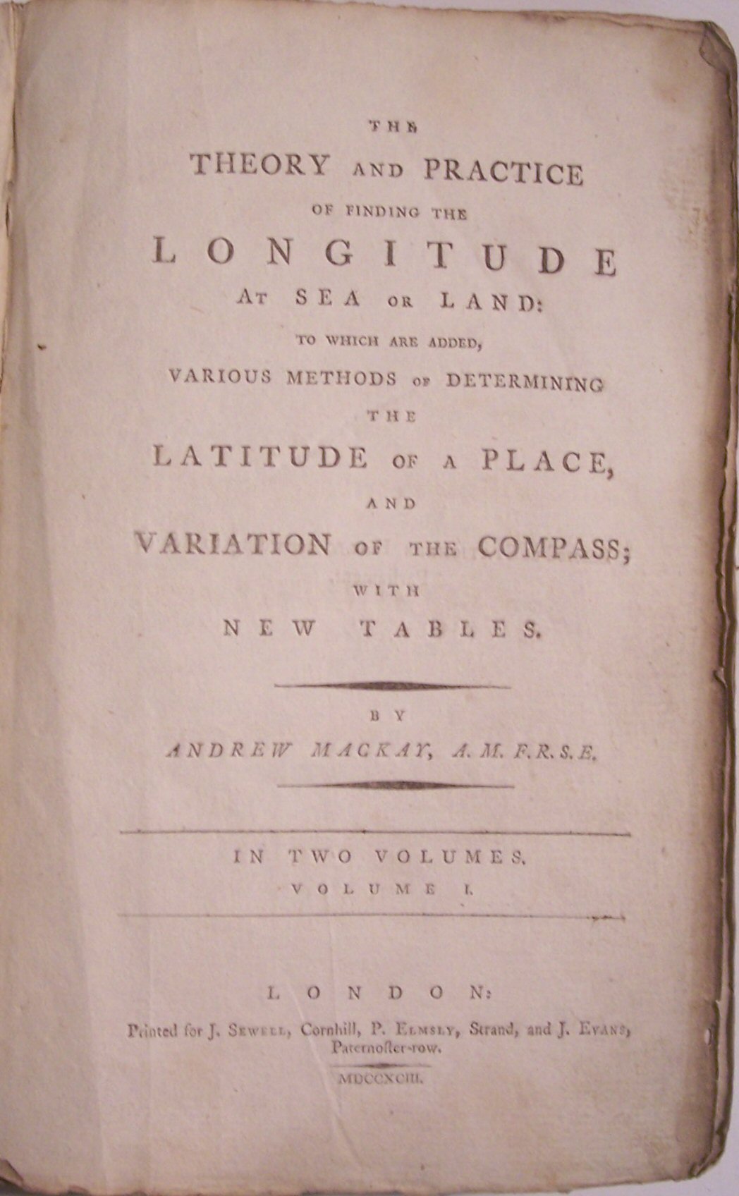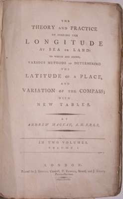 The theory and practice of finding the longitude at sea or land. London: for J. Sewell, et al., 1793, 8vo, 2 volumes in 1, half title, 7 folding plates, lacking list of subscribers, original boards, worn, lacking backstrip, half and full title loose in volume I, first gathering of volume II loose