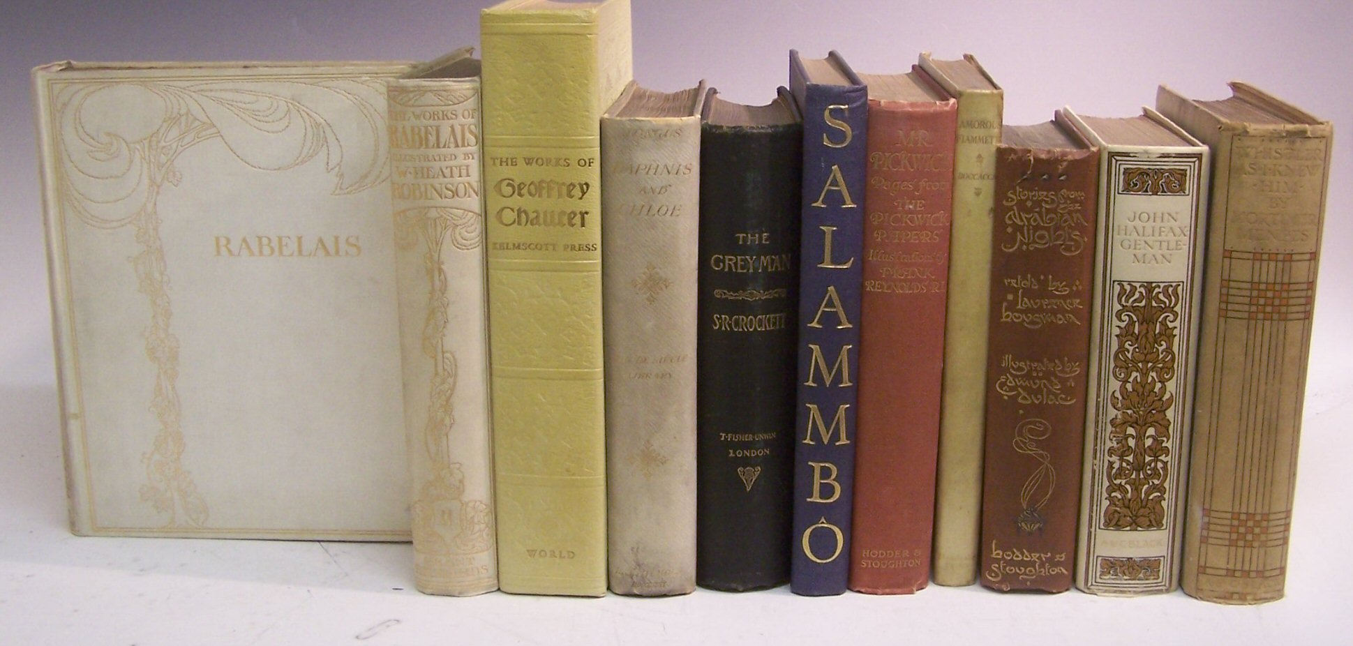 The works of Mr. Francis Rabelais. London, 1904, 4to, 2 volumes, illustrated, original cream cloth gilt, slight fading to backstrips, some light foxing; Dulac, Edmund Stories from the Arabian nights. London, 1907, second edition, 8vo, 50 tipped in colour plates, original decorative cloth gilt, chipped at head and tail of backstrip, interior clean; Mulock, Dinah John Halifax, gentleman. London, 1912, 8vo, number 78 of 250 copies, signed by the publisher, original vellum cloth gilt, t.e.g., some foxing to edges [Inman 237]; Menpes, Mortimer Whistler as I knew him. London, 1904, 8vo, number 227 of 500 copies, signed by Menpes, original etching of Menpes children as frontispiece, original white cloth gilt, rubbed, discoloured, foxing and staining throughout [Inman 261]; Flaubert, Gustav Salammbo. London, [no date], 4to, illustrated by Haydn Mackey, colour frontispiece and title, original blue cloth gilt, a clean copy; Collin, R. Daphnis and Chole. London, 1896, number 29 of 100 Japan paper copies, original morocco gilt, rubbed, interior clean; Reynolds, Frank Mr Pickwick, pages from the Pickwick Papers. London, [no date], 8vo, colour plates, original decorative cloth gilt, sunned, upper board stained; and 3 other illustrated volumes (11)