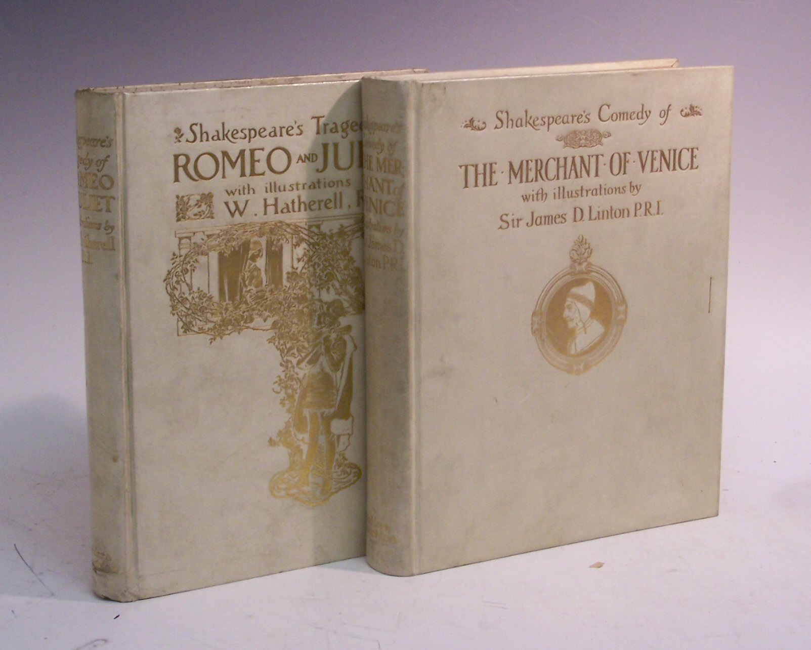 The merchant of Venice. London, [1909], 4to, number 200 of 500 copies, signed by the illustrator James D. Linton, 36 tipped in colour plates, original vellum gilt, lacking ribbon; Ibid Romeo and Juliet. London, [1912], 4to, number 171 of 250 copies, signed by the illustrator W. Hatherell, 22 tipped in colour plates, original vellum gilt, ribbon intact, some dustmarking to vellum (2)