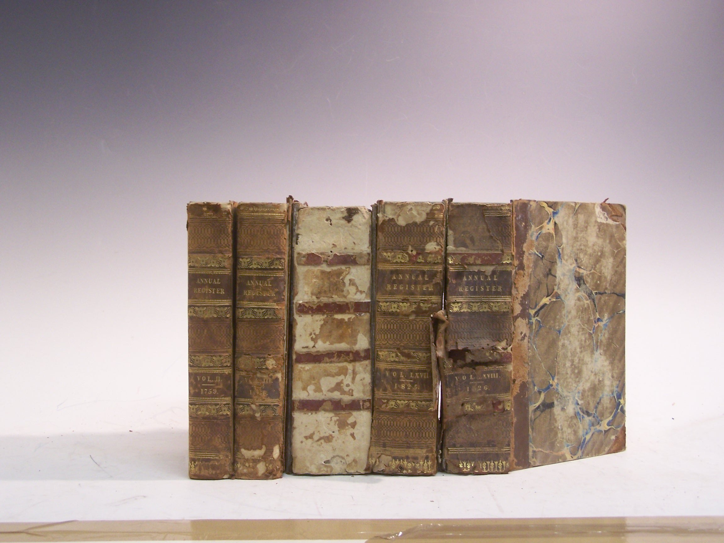The annual register or a view of the history, politicks and literature. London, 1759-1839, 8vo, 84 volumes, contemporary half calf gilt, very worn, extensive worm damage, several volumes with boards detached and lacking backstrips. Sold not subject to return (84)