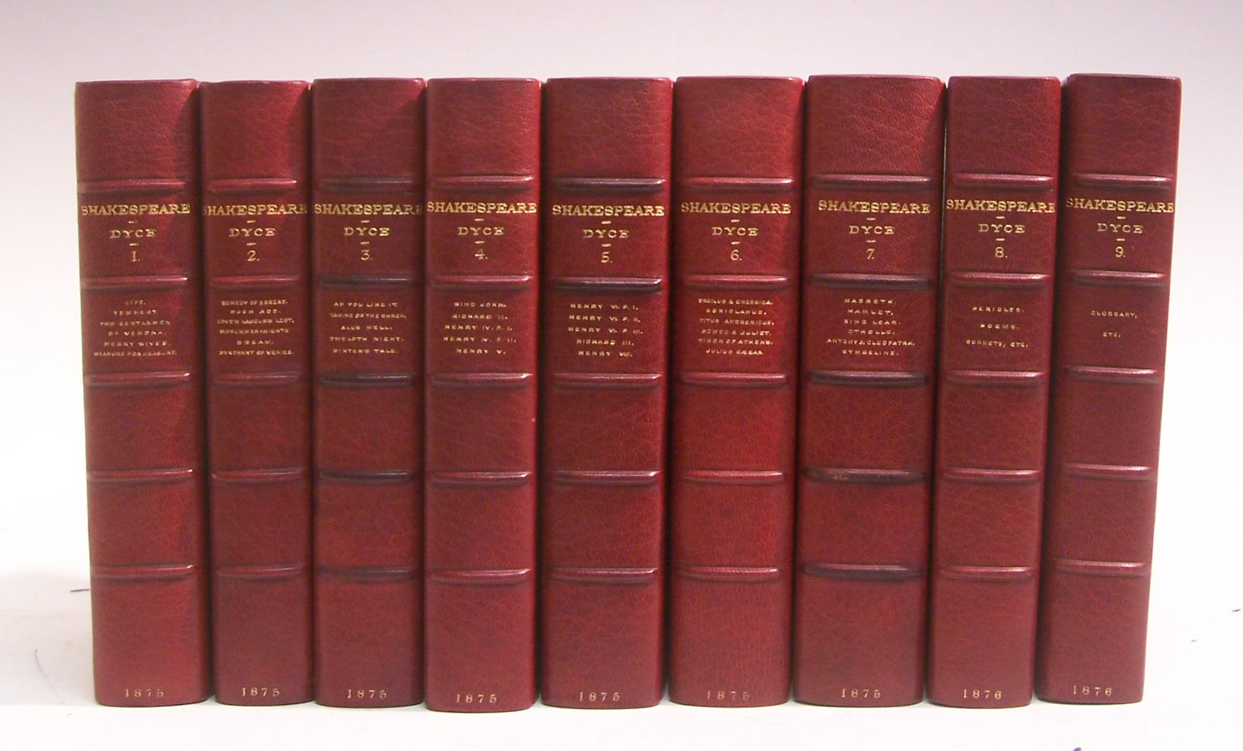 The works of... London: Chapman & Hall, 1875, third edition, 8vo, 9 volumes, edited by Alexander Dyce, portrait frontispiece, later half red morocco gilt by Charles E. Lauriat, marble endpapers, t.e.g. (9)