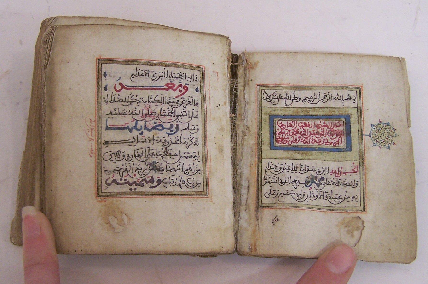Dala 'il al -Khairat. Dased: 1199 A. H. miniature Arabic manuscript on glazed paper. Binding 3 " tall x 2 " wide, 166 leaves of text plus 4 rear endpapers written over in a non-scribal hand, text mainly in red and black within double ruled red border, occasional orange, purple and blue, two full pages with most attractive architectural illustration (gilded), a few lines of text from time to time within gilded cartouches, in original morocco, pretty arabesque-shaped central panel depicting various flowers on each cover, one joint cracked