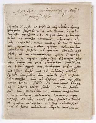 [Nova Calendarii Forma]. [begin F. IR:] [Amplissmis prudentissmis dominis patronis observantissmis S.P.] Inserunt... ut novi calendarij formam diligenter perpenderem, et inde dicerem, an talis correctio necessaria sit... [end F. 6V:] Haec ad mandata v.a. respondere in Praesentia visum est, submittere oro, ut v.a. hanc meam tenuitatem horis consutlant & mea servitia sibi commendata habeant i.p. Altdorf, 1582, 4to (200 x 152mm.), manuscript on paper, 8 leaves, blank 7r (p. 13) and 8v (except for inscription), sewn, without covers
