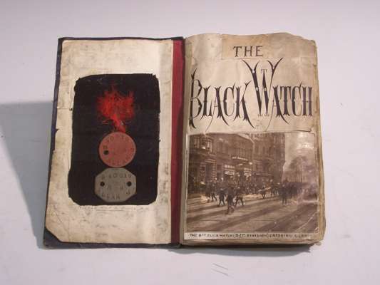 Diary of the Great War, Private James Allan 2/1 Fife & Forfar Yeomanry, Home Unit 29th January 1917 to 14th October 1917, Overseas unit 8th Batt. Black Watch (9th Division) 15th October 1917 to 21st April 1919, approx 13 x 21.5cm, 27 pages of manuscript text, pasted in postcards, illustrations and photographs, identity discs and kilt sample pasted onto front pastedown, original cloth, rubbed, some chipping to page edges