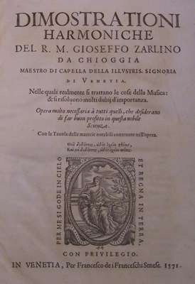 First edition of Zarlino's second main treatise of music theory. The first was Le institutioni harmoniche (Venice 1558), "a landmark in the history of music theory" (New Grove). Dimostrationi harmoniche is of a highly speculative and scientific nature. It is in the form of a dialogue between Zarlino himself; three well-known musicians of the times (Franceso Viola, Choir Master of Alfonso d'Este, Duke of Ferrara; Claudio Merulo, organist of St. Mark's in Venice; and Adrian Willaert, Choir Master of the Venetian Republic and Zarlino's teacher); and a fourth, probably fictional, character, the philosopher Desiderio from Pavia. 1519-1590), Zarlino, theorist and composer, typifies the Venetian intellectual world of the 16th century. Ordained in 1541, he had a wide linguistic, philosophical, scientific and artistic culture. The publication of his first music treatise Le institutioni harmoniche earned him high praises and, in 1565, appointment as Choir Master of St. Mark's. Not a prolific composer (his only practical work is the learned and polished 'Modulationes VI Vocum' 1566), he was however the leading counterpoint theorist of the 16th century.