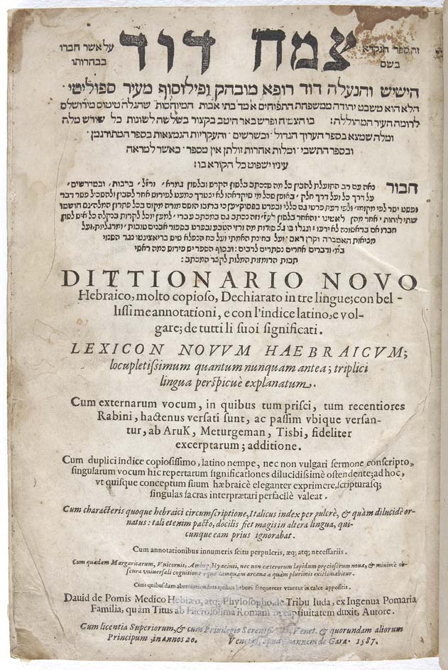 First edition of De Pomis' famous Italian, Latin, Hebrew and Aramaic Dittionario Novo Hebraico. This work was new in two ways, as an original digest of its major predecessors, and as a source (according to the author) of largely unknown new terms, mainly historical and scientific. The dictionary uses as its major sources the Shoroshim of David Kimchi (?1160-?1235), a philological dictionary printed before 1480; the Tishbi of the philologist, grammarian and lexicographer Elijah Levita (1468/9-1549), whose work was first published at Isny in 1541 and the Aruch of Nathan Ben Yechiel (1035-c.1110), a lexicon of the Talmud and Midrashim, published in Rome in 1462-1472, whose author according to one legend was a member of the De Pomis family. The author dedicated the work to Sixtus V, who had revoked a ban on Jewish doctors treating Christian patients, which had been put in place by his predecessor Pius V. This had been a major infringement on the life of De Pomis, who was by profession a physician, and who furthermore argued in a treatise in 1588 that it was the duty of Jewish doctors to treat Christians.