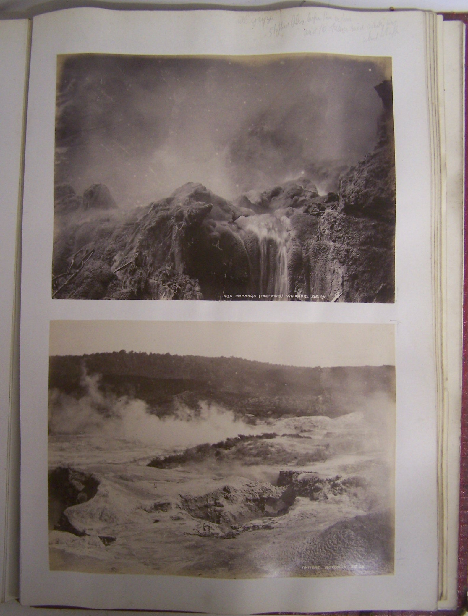 A photograph album containing late 19th century prints of Malta, Port Said, Suez Canal, Columbo, Melbourne, New South Wales [including 4 cave shots], Auckland harbour, Roturua, average size approx 20 by 16cm & 28 by 21cm, some pencil and ink captions, pasted to both sides of leaves, some images with a pink hue, some fading to edges, full red morocco, rubbed