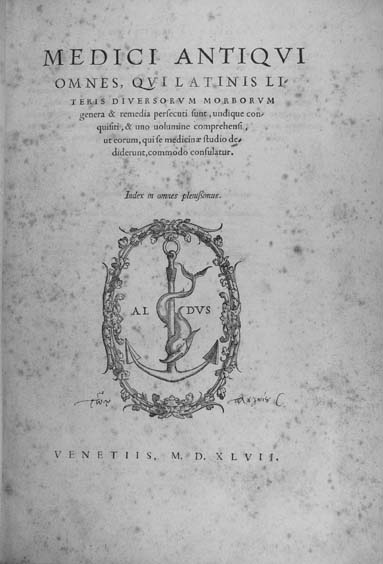 Medici antiqui omnes. Venice: apud Aldi filios, 1547, folio, Roman letter, printer's anchor and dolphin device within floreated oval border on title-page and verso of last, some woodcut initials, early 18th century French gilt-panelled red morocco, spine in seven gilt compartments, joints neatly repaired, a.e.g., green silk marker, some foxing to title-page