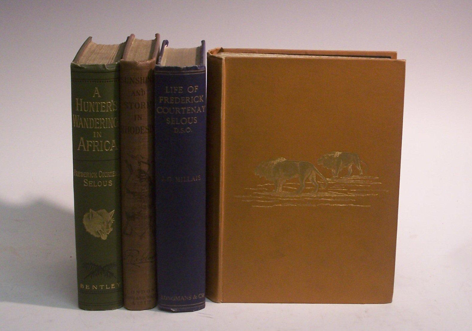 A hunter's wanderings in Africa. London, 1895, fourth edition, 8vo, illustrated, original green cloth gilt, very slight rubbing at edges, bookplate; Ibid Sunshine and storm in Rhodesia. London, 1896. First edition, plates and folding map, original cloth, backstrip discoloured, bookplate; Ibid Travel and adventure in South-East Africa. London, 1893, third edition, 8vo, illustrated, folding map, original cloth gilt, a very clean copy, bookplate; Millais, J.G. Life of Frederick Courtenay Selous, D.S.O. London, 1919, second edition, 8vo, illustrated, original blue cloth gilt, rubbed at edges (4)