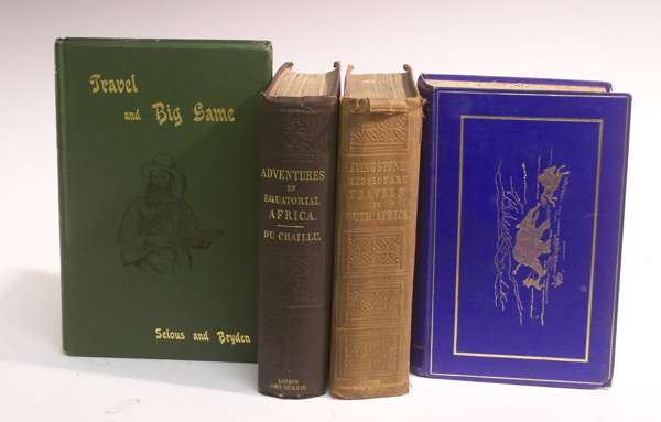 The Nile tributaries of Abyssinia. London, 1867. First edition, 8vo, double portrait frontispiece, 2 maps, 23 plates, original blue decorative cloth gilt, gilt stamp of elephant chase on upper board, some rubbing to edges, bumping to corners, interior very clean; Selous, Percy. & Bryden, H.A. Travel and big game. London, 1897, 8vo, 6 plates, original cloth, a very clean copy, bookplate; Chaillu, Paul B. Du Explorations and adventures in Equatorial Africa. London, 1861, 8vo, folding frontispiece, folding map torn, original decorative cloth gilt, some rubbing to edges, interior clean; Livingstone, David Missionary travels and researches in South East Africa. London, 1857, 8vo, folding frontispiece, original cloth gilt, backstrip faded, inner hinges splitting (4)