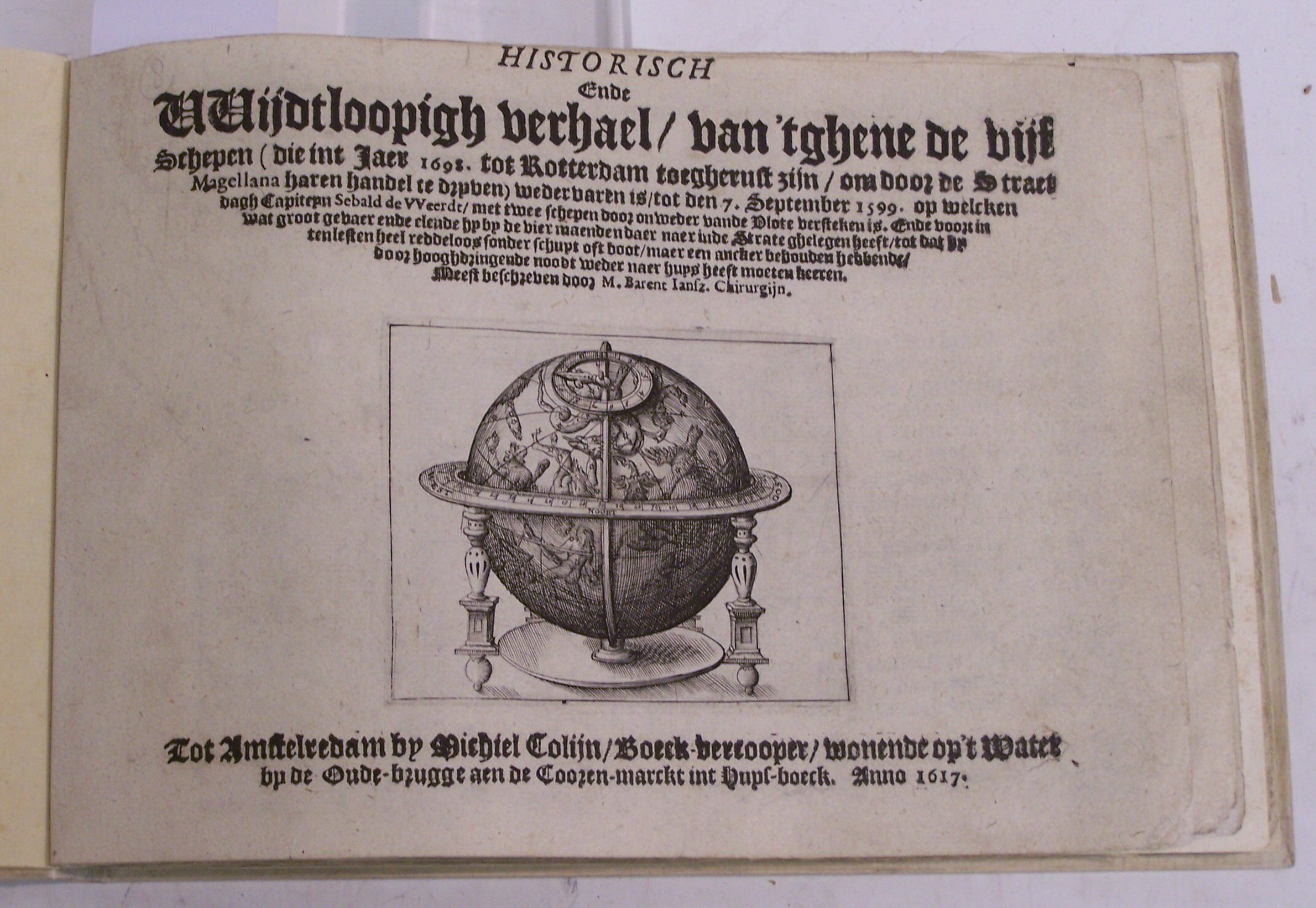 Historish ende wijdtloopigh verhael, van 'tghene de vijf Schepen. Amsterdam: M. Colijn, 1617, oblong 4to, pp. 77 [pp.34 numbered 43, pp.76-77 numbered 72-73], pages pp.11-14 in facsimile, woodcut ornament, 8 plates, engraved vignette to title, modern vellum, interior clean
