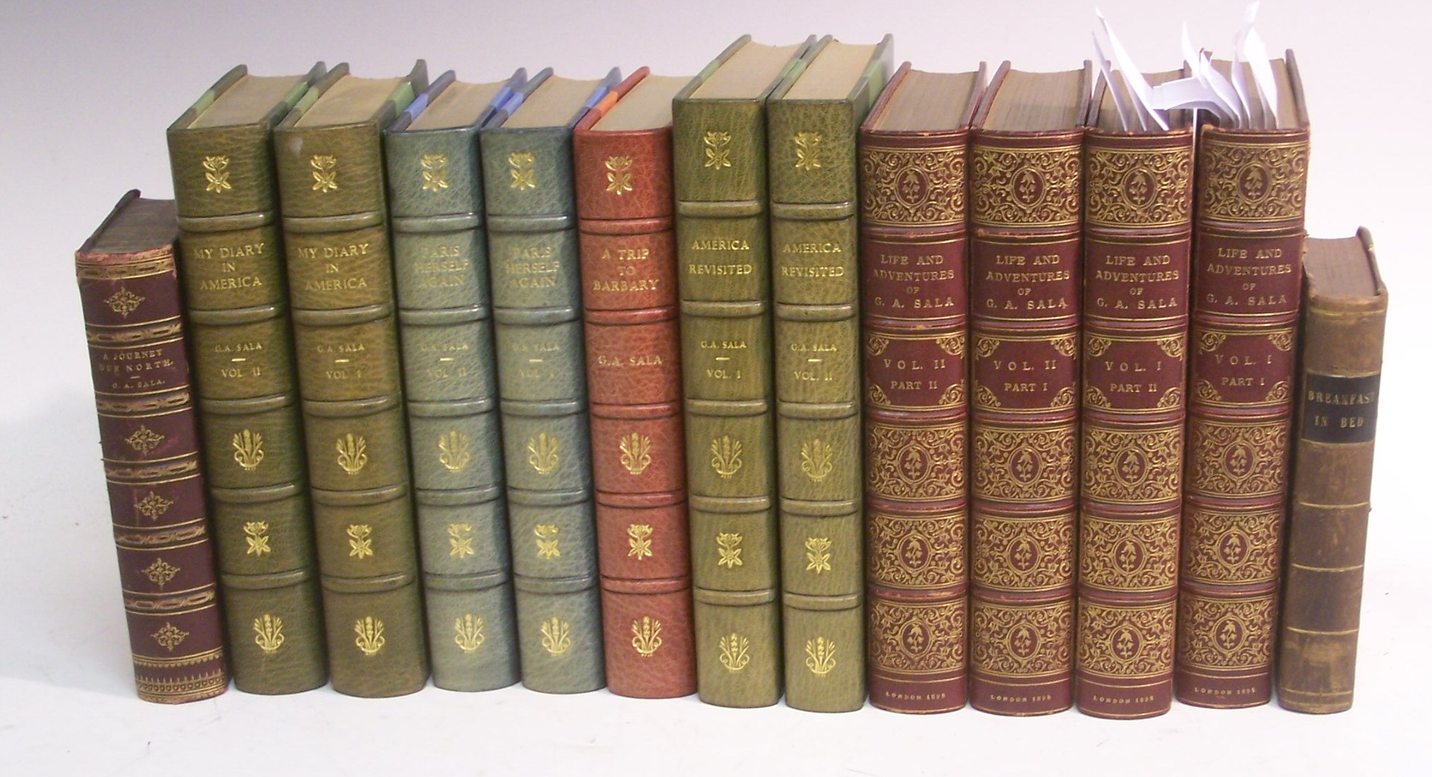 A journey due north being notes of a residence in Russia in the summer of 1856. London, 1859, second edition, 8vo, contemporary half morocco gilt, rubbed at edges; Ibid Breakfast in bed. London, 1864, 8vo, contemporary half calf gilt, black label, some rubbing to edges; Ibid My diary in America in the midst of war. London, 1865, second edition, 8vo, 2 volumes, later half morocco gilt by Hatchards, t.e.g., backstrips faded; Ibid A trip to Barbary by a roundabout route. London, 1866, 8vo, later half morocco gilt by Hatchards, t.e.g., a clean copy; Ibid Paris herself again in 1878-9. London, 1879, 8vo, 2 volumes, illustrated, later half morocco gilt by Hatchards, ink stamp on titles, some foxing; Ibid America revisited. London, 1882, 8vo, 2 volumes, illustrated, later half morocco gilt by Hatchards, foxing; Ibid The life and adventures of... London, 1895, 8vo, 2 volumes in 4, extra illustrated, later full red morocco gilt extra by H. Wood, hinges rubbed, bookplate (13)