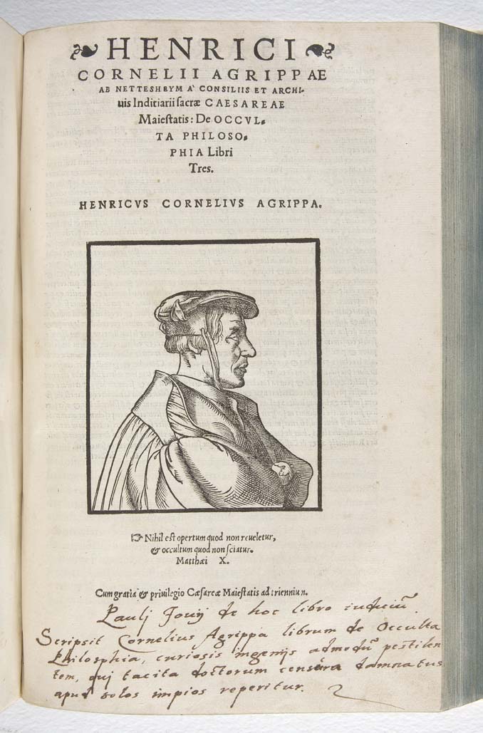 Agrippa von Nettesheim's writings brought him into conflict with the Inquisition and he was charged with heresy. De occulta philosophia is a defence of magic, by means of which men may come to a knowledge of nature and of God, and contains Agrippa's idea of the universe with its three worlds or spheres. Caillet 93; Adams A386, suggesting Basle imprint.