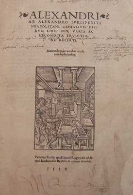 Genialium dierum libri sex … Paris: vaeneunt apud Ioanne Roigny [in fine: excudebat in aedibus Carolae Guillard], 1539. Folio, printer's device of a printing press on the titlepage, later quarter calf, marbled boards, rubbed, title-page dusty, with early inscriptions and outer, lower corner torn away, occasional marginal notes in an early hand and underscoring, lacking the last blank