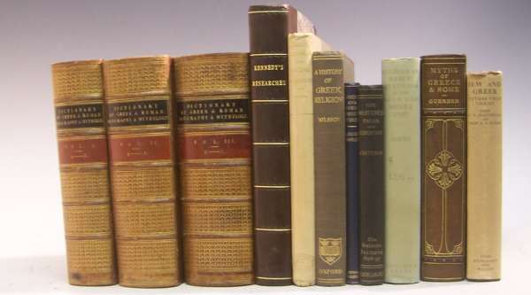 Dictionary of Greek and Roman biography and mythology. London, 1844, 8vo, 3 volumes, edited by William Smith, contemporary calf gilt, some rubbing, volume I lacking front endpaper; Noel, F. Dictionnaire de la fable. Paris, 1823, 8vo, 2 volumes, contemporary half calf gilt, some rubbing, corners bumped ; Kennedy, Lt. Col. Vans Researches into the nature and affinity of ancient and Hindu mythology. London, 1831, 4to, modern half calf gilt, some foxing, corner of title page torn away; Smith, M. Studies in early mysticism in the Near and Middle East. London, 1931, 8vo, original cloth, dustwrapper; Guerber, H.A. The myths of Greece and Rome. London, 1918, 8vo, illustrated, contemporary half morocco gilt, some fading; Taylor, Thomas The Eleusinian and Bacchic mysteries. New York, 1891, fourth edition, 8vo, illustrated, original cloth gilt; Nillsson, Martin A history of Greek religion. Oxford, 1925, 8vo, original cloth gilt; Cheetham, S. The mysteries Pagan and Christian. London, 1897, 8vo, original cloth gilt; and a quantity of other material, mainly modern, on ancient cultures (quantity)