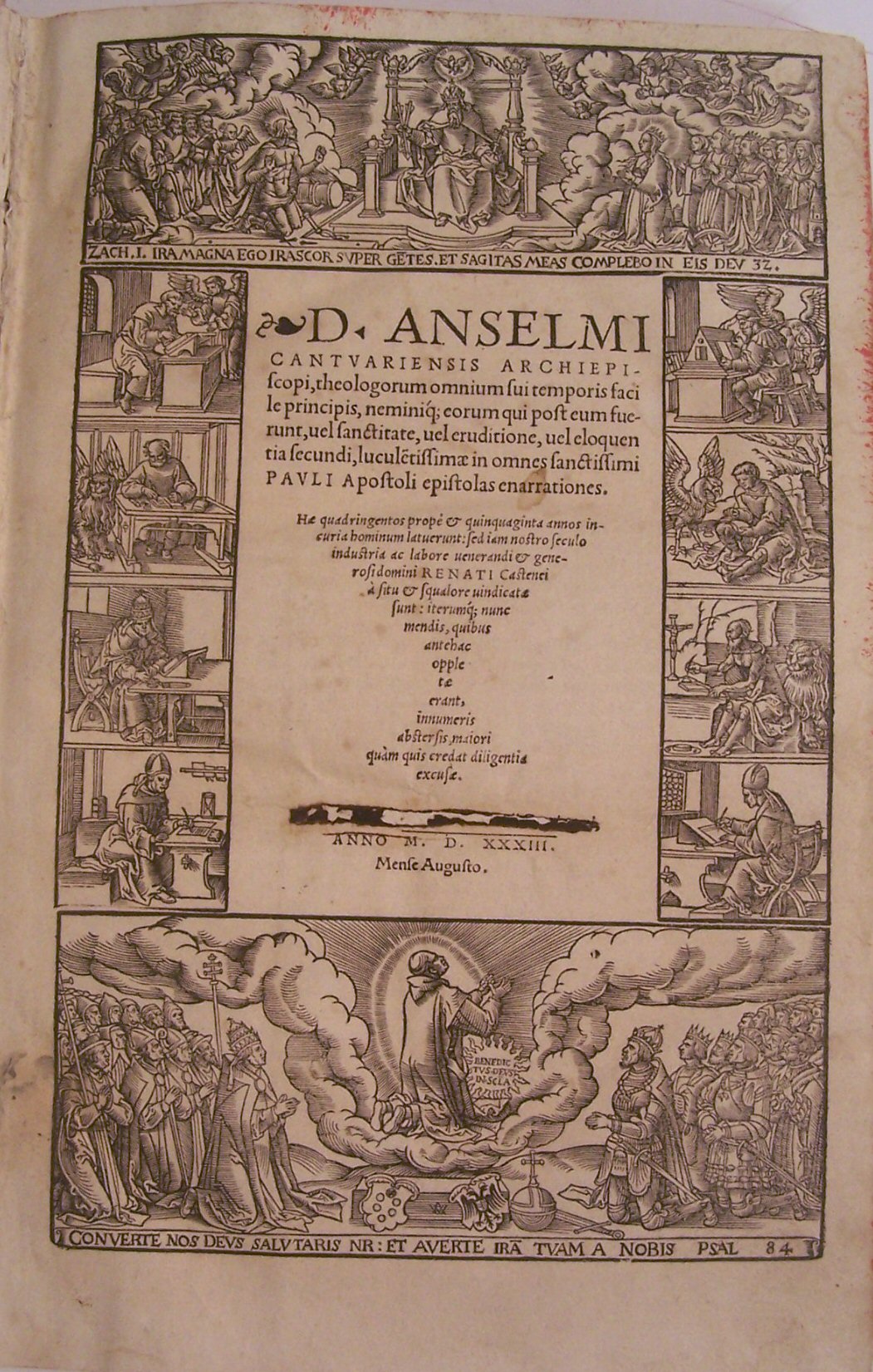 In omnes sanctissimi Pauli apolstoli epistolas enarrationes. Cologne: E. Ceruicornus, 1533, folio, title within woodcut border, woodcut initials, seventeenth century vellum, slight worming to a few headlines, early annotations, owner's name inked out on title and last leaf creating small hole, repaired on verso, and with partial loss of imprint at end, a few leaves slightly bronwed or damp-stained in upper margin at end