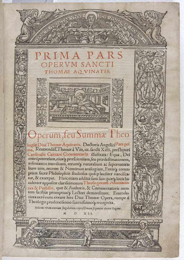Note: Not in Adams or the BL. With the commentaries of Cardinal Tommaso de Vio Gaetani Cajetan (1469-1534). "In theology Cajetan is justly ranked as one of the foremost defenders and exponents of the Thomistic school. His commentaries on the "Summa Theologica", the first in that extensive field, begun in 1507 and finished in 1522, are his greatest work and were speedily recognized as a classic in Scholastic literature. The work is primarily a defence of St. Thomas against the attacks of Scotus. In the third part it reviews the aberrations of the Reformers, especially Luther. The important relation between Cajetan and the Angelic Doctor was emphasized by Leo XIII, when by his Pontifical Letters of 15 October, 1879, he ordered the former's commentaries and those of Ferrariensis to be incorporated with the text of the "Summa" in the official Leonine edition of the complete works of St. Thomas." (Cath. Encyc.)